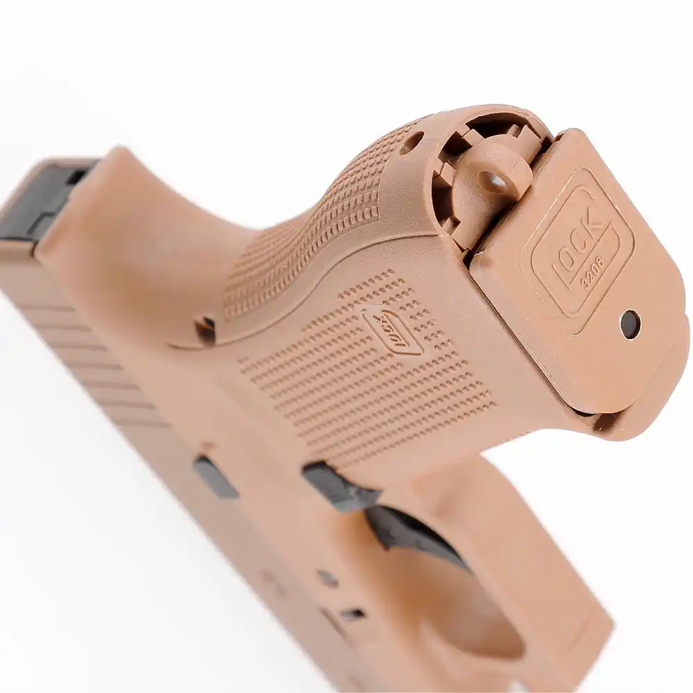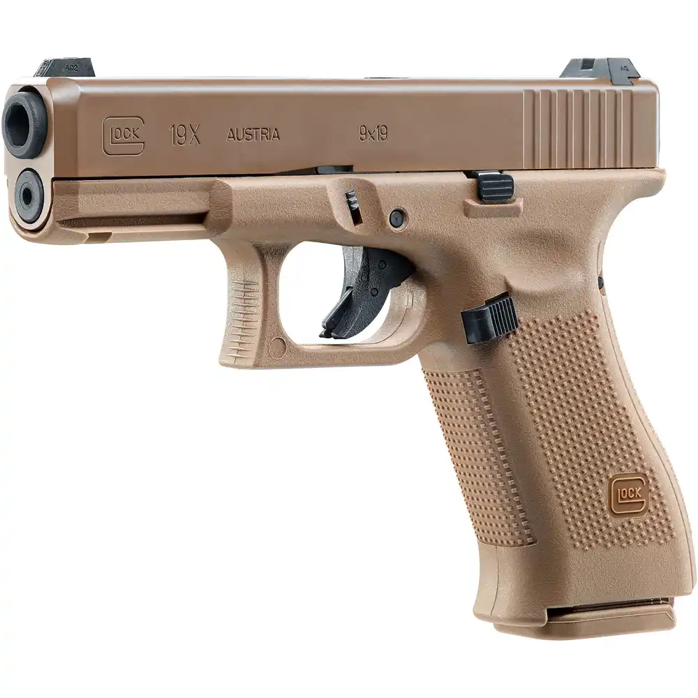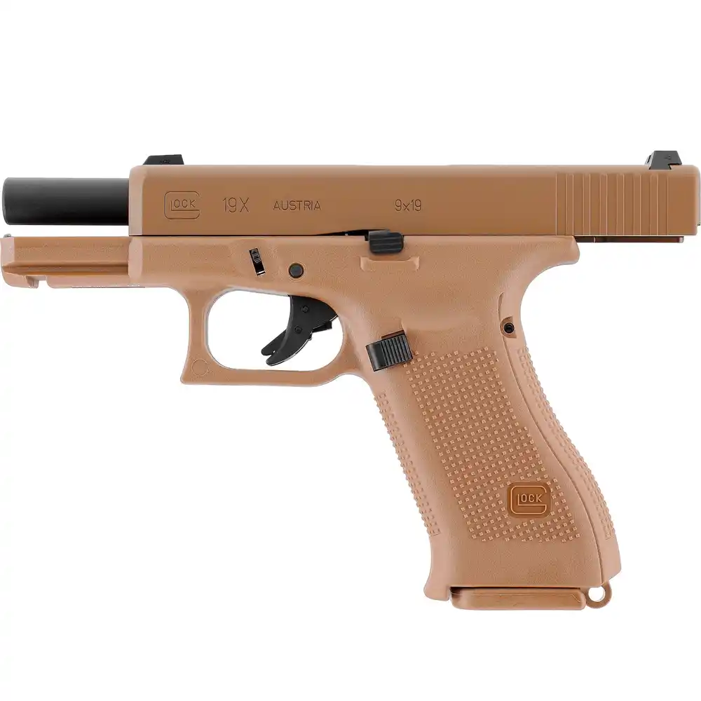 Glock 19X Airsoft GBB Coyote vs. Glock 19 Airsoft GBB : Le 19X offre une poignée plus longue que le G19, permettant une prise en main plus stable et une capacité de chargeur accrue.
